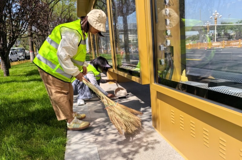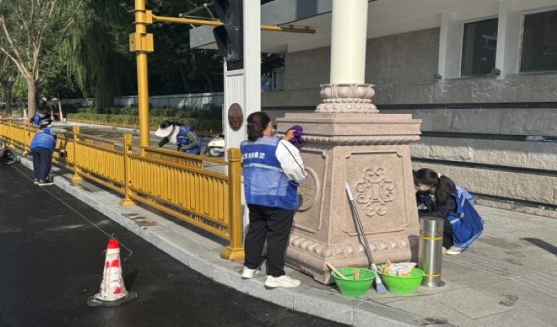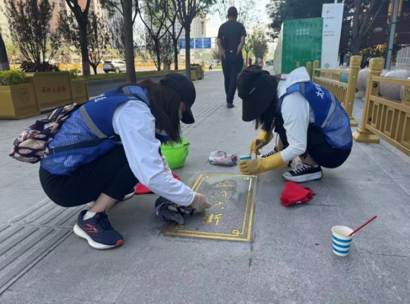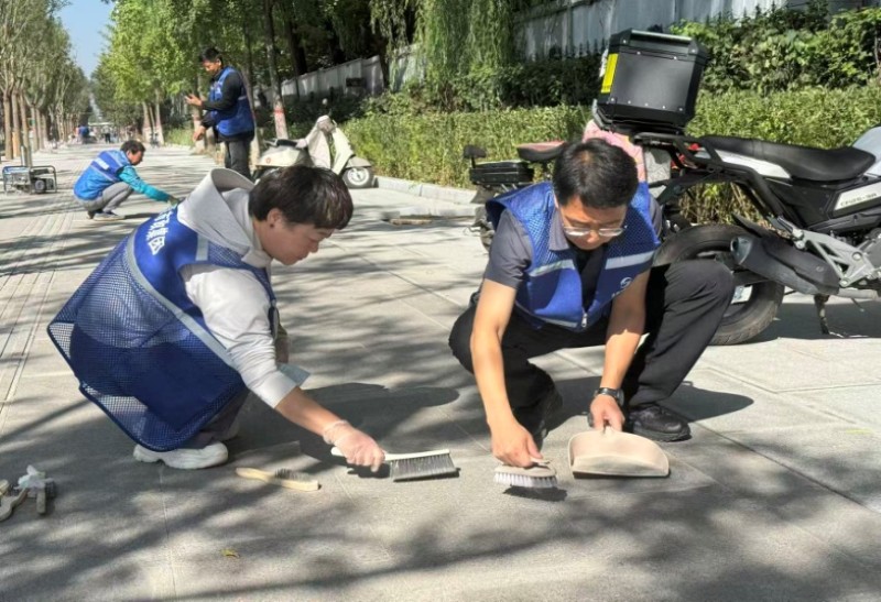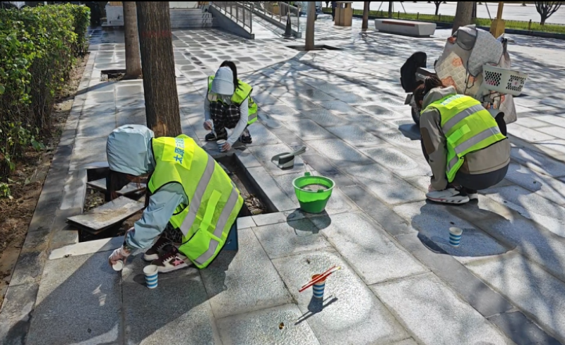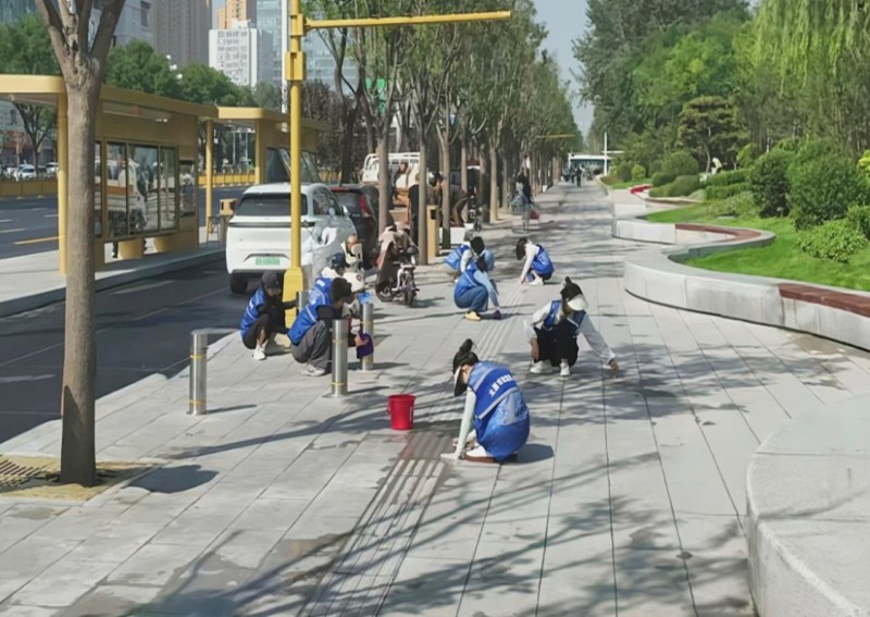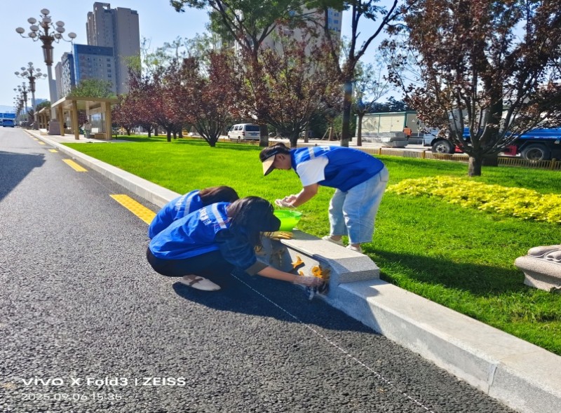 活動自9月4日起為期六天,覆蓋迎澤大街(西段)全線,重點(diǎn)圍繞附屬設(shè)施清潔與道路精細(xì)化維護(hù)展開?;顒又校碇y(tǒng)一藍(lán)色“太原市政集團(tuán)”馬甲的志愿者們,手持長柄擦洗器、水桶、抹布、鏟刀、掃帚等工具,對道路兩側(cè)公交站臺、路燈基地、護(hù)欄、照明燈桿等設(shè)施進(jìn)行系統(tǒng)清理與擦洗;同步推進(jìn)地磚灌縫精細(xì)化維護(hù)作業(yè),通過專業(yè)操作,確保每一條裂縫都“嚴(yán)絲合縫”,有效提升路面耐用性與通行舒適度,以實(shí)際行動為市民出行安全與舒適保駕護(hù)航;同時(shí),志愿者專門對道路沿線的石頭字景觀展開描金作業(yè),細(xì)刷蘸取金色涂料,一筆一畫精心描摹,成為主干道上一道兼具文化氣息與視覺美感的獨(dú)特風(fēng)景。